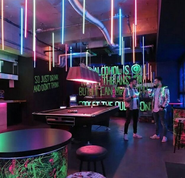 【店舗紹介】 新潟・古町の夜を彩る、ネオン輝く大人の遊び場。ビリヤードやダーツが楽しめる広々とした空間で、良質な音楽と非日常的な時間を楽しめる人気ダイニングバーです。