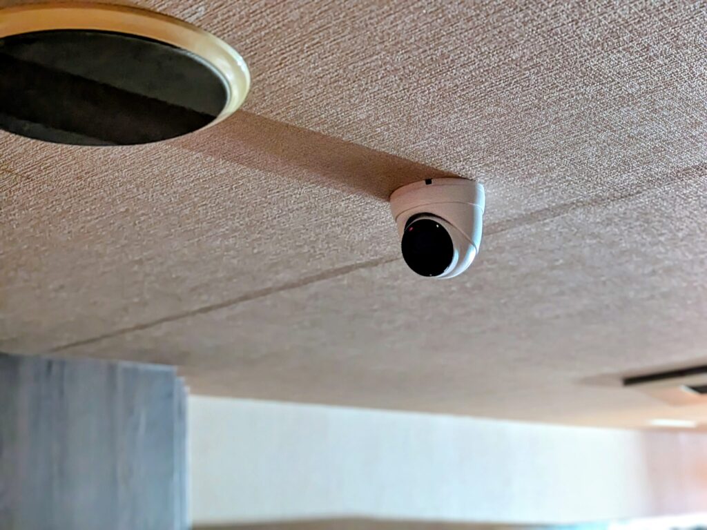 3-2. ホテルの雰囲気を壊さない小型デザインと逆光補正機能 防犯性能を高めつつも、お客様のプライベートな空間としての「居心地の良さ」を損なわない配慮も欠かせません。廊下には威圧感を与えないドーム型の小型カメラを採用。また、入り口付近の激しい明暗差で映像が白飛びするのを防ぐ「逆光補正(ワイドダイナミックレンジ)」機能を活用し、どの時間帯でも最適な露出で記録できるよう調整を行いました。